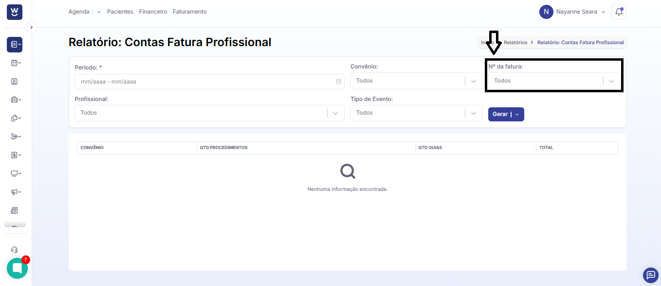 No campo seguinte informe o n° da fatura que deseja filtrar o relatório.