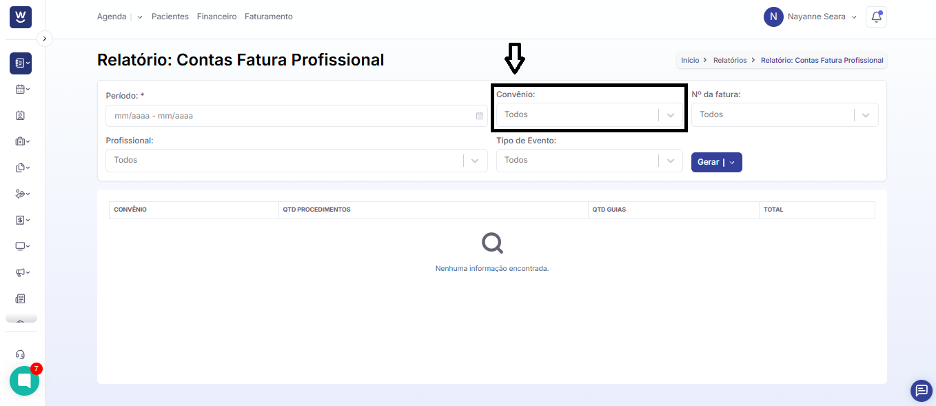 No campo “convênio”, podemos filtrar por um ou mais convênios. Caso deseje filtrar por todos os convênios, deverá deixar o campo em branco.