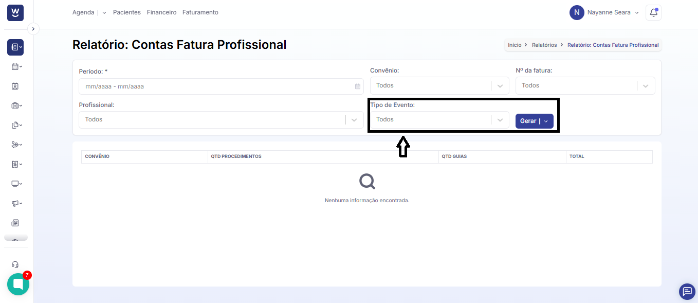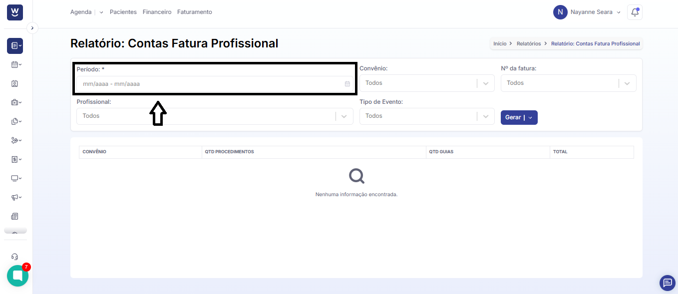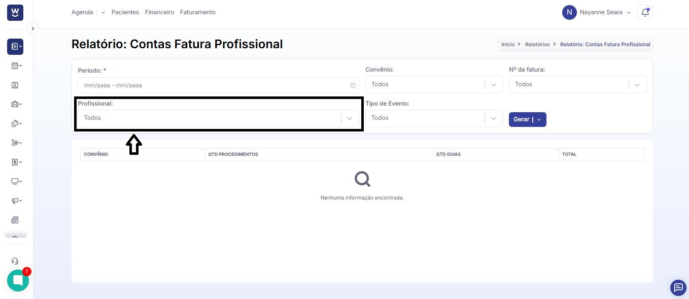 O próximo campo a ser preenchido será o “profissional”, em que podemos filtrar o relatório de agenda para apenas um profissional ou deixá-lo com a opção em branco, que irá filtrar para todos os profissionais.