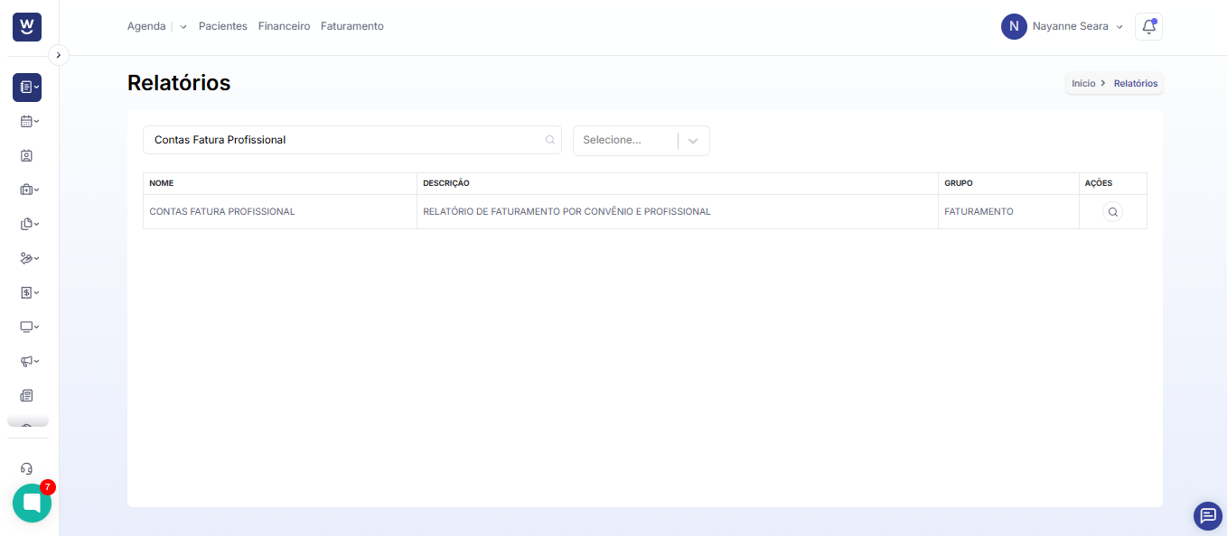 No campo "Nome do Relatório", digite o nome do relatório que deseja localizar, como "Contas Fatura Profissional". Após digitar, clique no nome do relatório exibido para que ele seja aberto em sua tela.