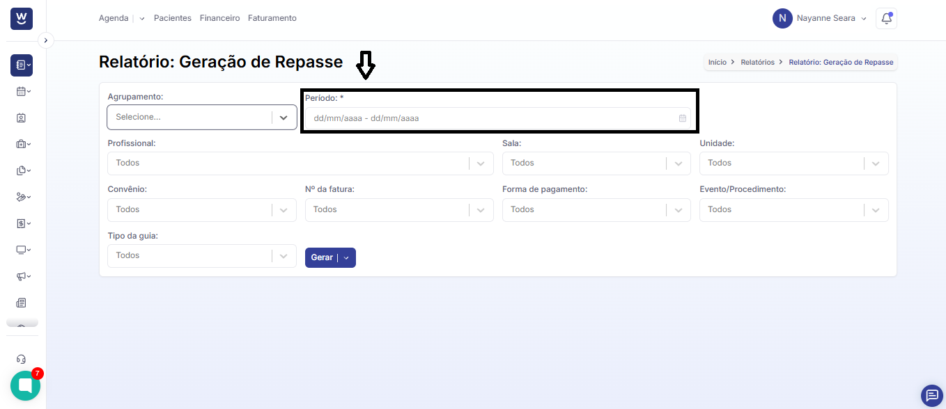 No campo seguinte, informe o “Período”, no qual será necessário informar o intervalo de tempo desejado para a geração do relatório.
