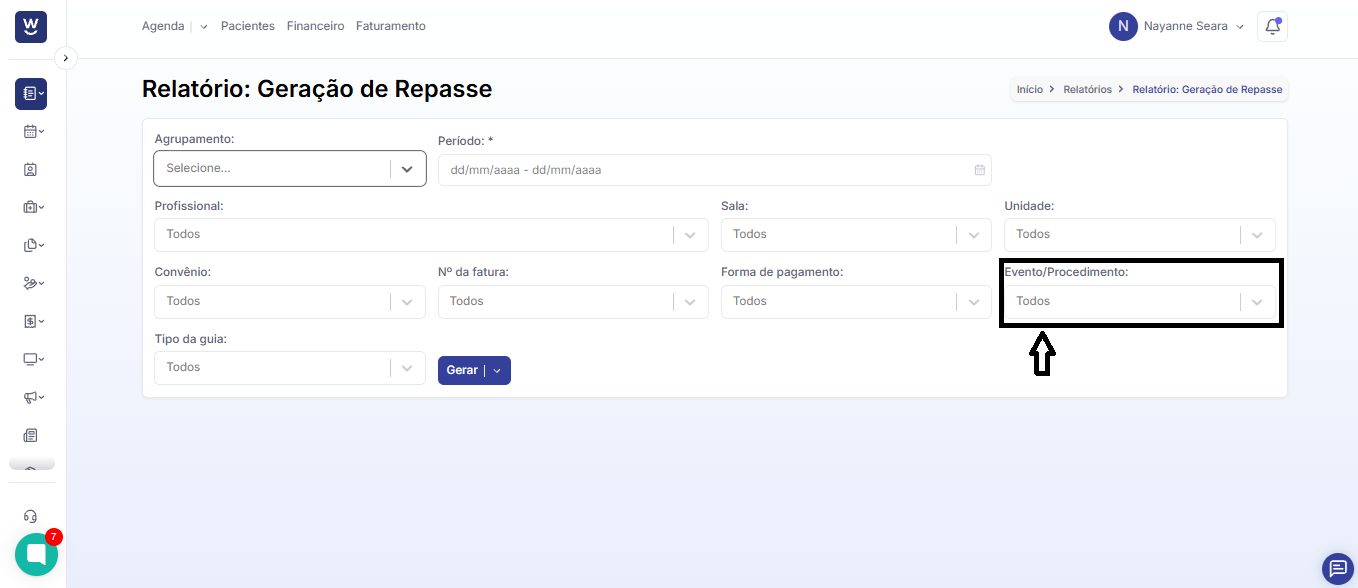 O próximo campo a ser preenchido é o “Evento/Procedimento”. Nesse filtro, podemos filtrar por um ou mais procedimentos. Caso deseje filtrar todos os procedimentos realizados, deverá deixar o campo em branco.