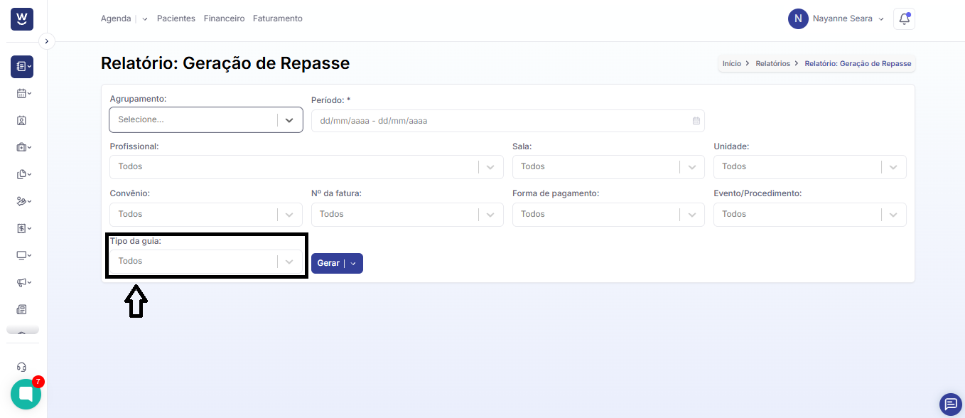 No campo seguinte, é possível filtrar pelo “Tipo da guia” que deseja filtrar, seja de consulta, exames/procedimentos, ou deixar com a opção “Todos”, que irá filtrar para todos os tipos de guias.