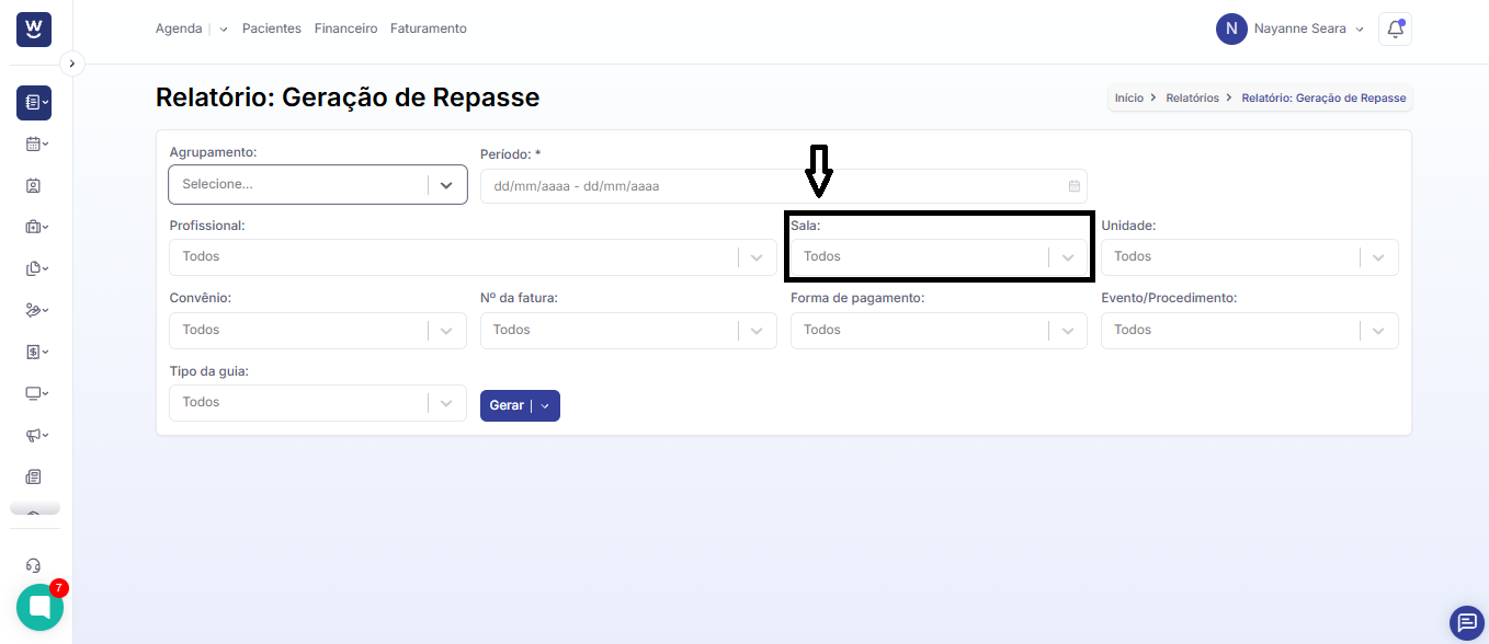 No campo seguinte, você pode filtrar por salas, caso deseje filtrar apenas por uma, ou deixe como todas caso deseje filtrar por todas as salas.