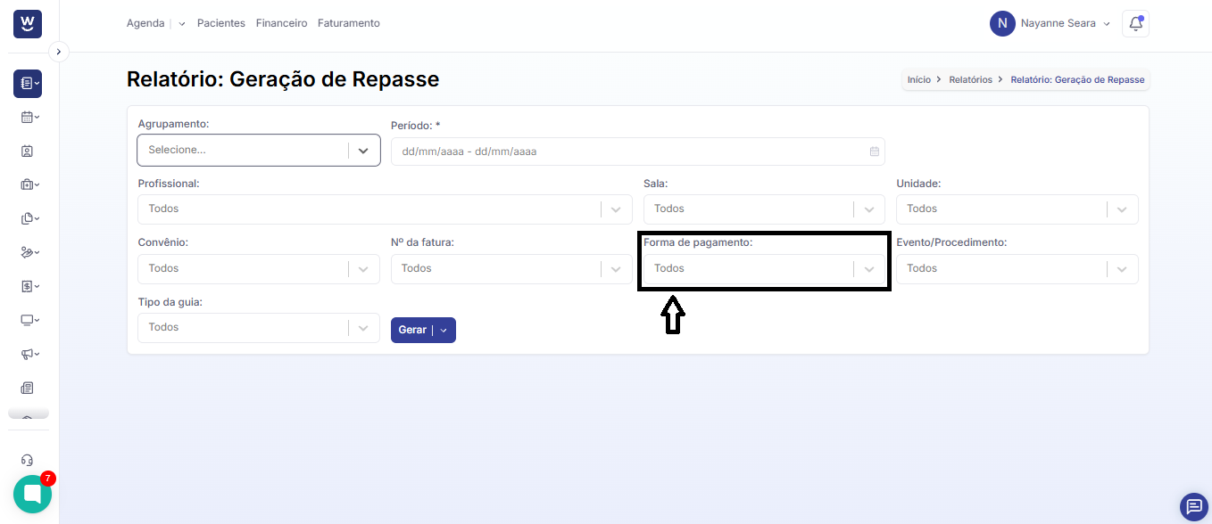 O próximo passo é informar o campo “forma de pagamento”, caso deseje filtrar por uma opção específica. Se quiser incluir todas as formas de pagamento, basta selecionar a opção “Todos”.