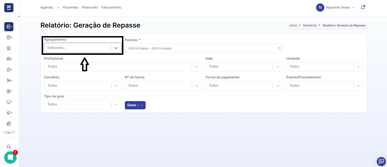 Nesta página exibida, você deverá preencher os filtros e opções para gerar o relatório Geração de Repasse. Começaremos pelo filtro “Agrupamento”, no qual será necessário informar se esse repasse será gerado para um profissional ou para uma sala.