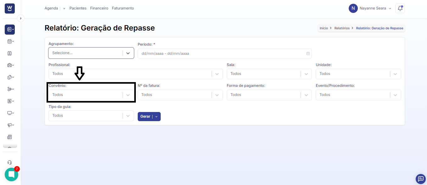 No campo “convênio”, podemos filtrar por um ou mais convênios. Caso deseje filtrar por todos os convênios, deverá deixar o campo em branco.