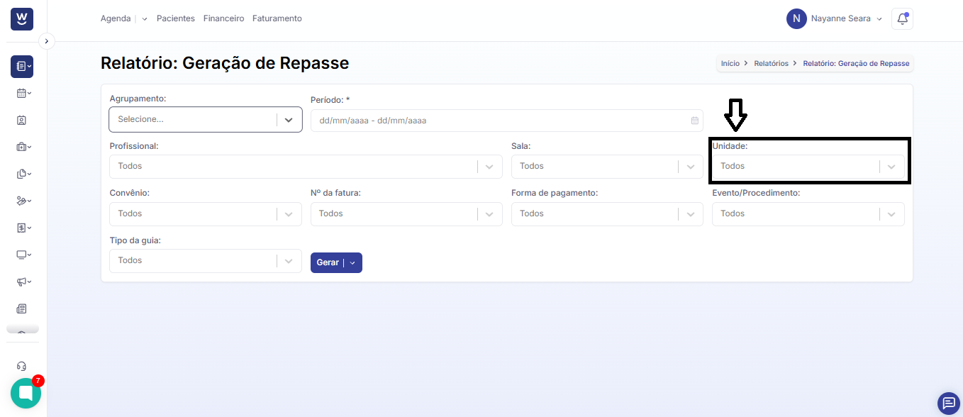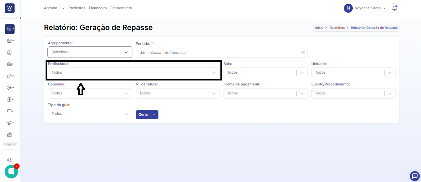 O próximo passo é informar para qual profissional deseja gerar o repasse. É possível gerar o repasse para um profissional específico ou para todos os profissionais da clínica.