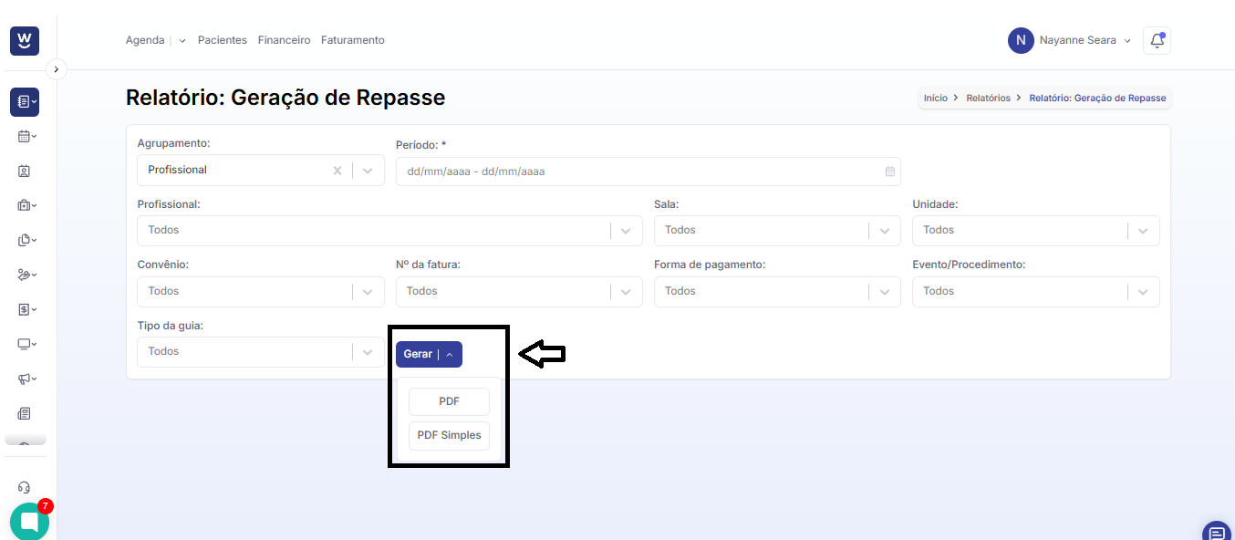 A opção PDF gera o arquivo completo de repasse, com as informações de valores tanto do profissional quanto da clínica. Já o PDF simples apresenta apenas os valores referentes ao profissional no documento gerado.