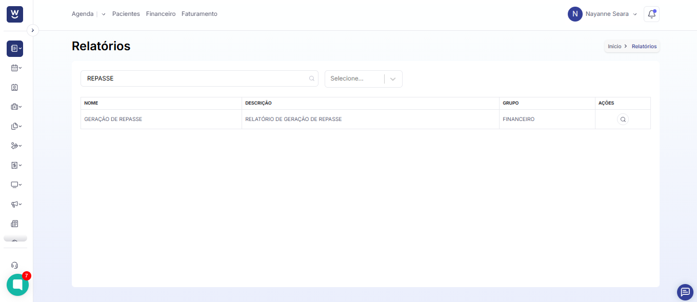No campo "Nome do Relatório", digite o nome do relatório que deseja localizar, como "Geração de Repasse". Após digitar, clique no nome do relatório exibido para que ele seja aberto em sua tela.