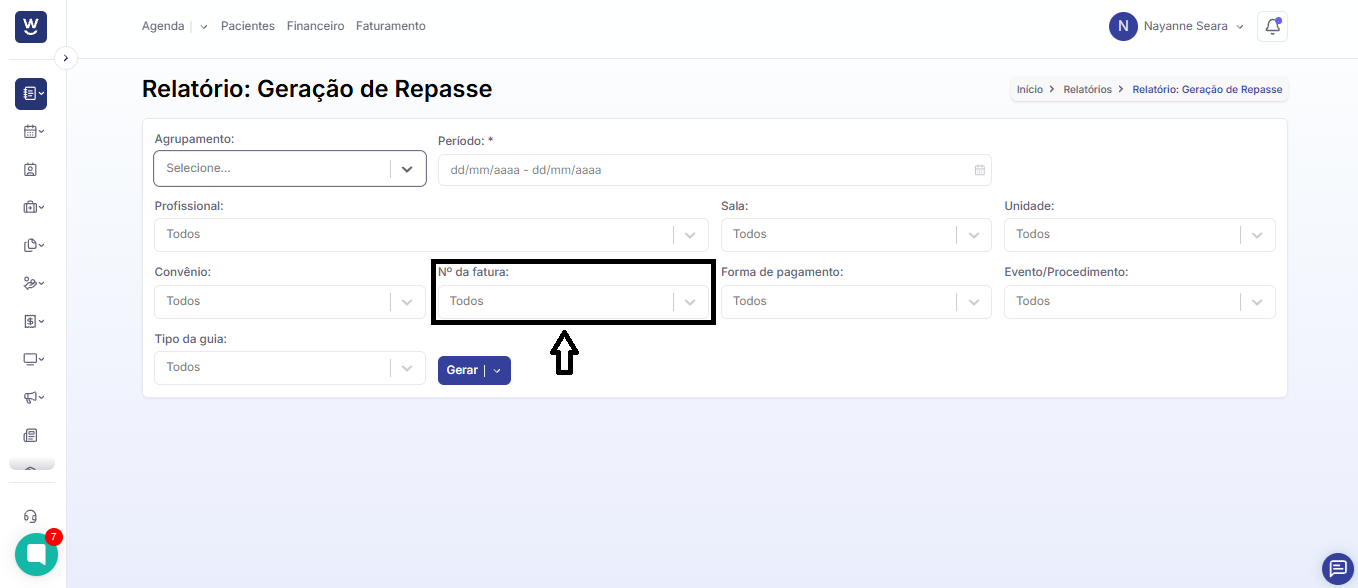 No campo seguinte informe o n° da fatura que deseja filtrar o relatório.