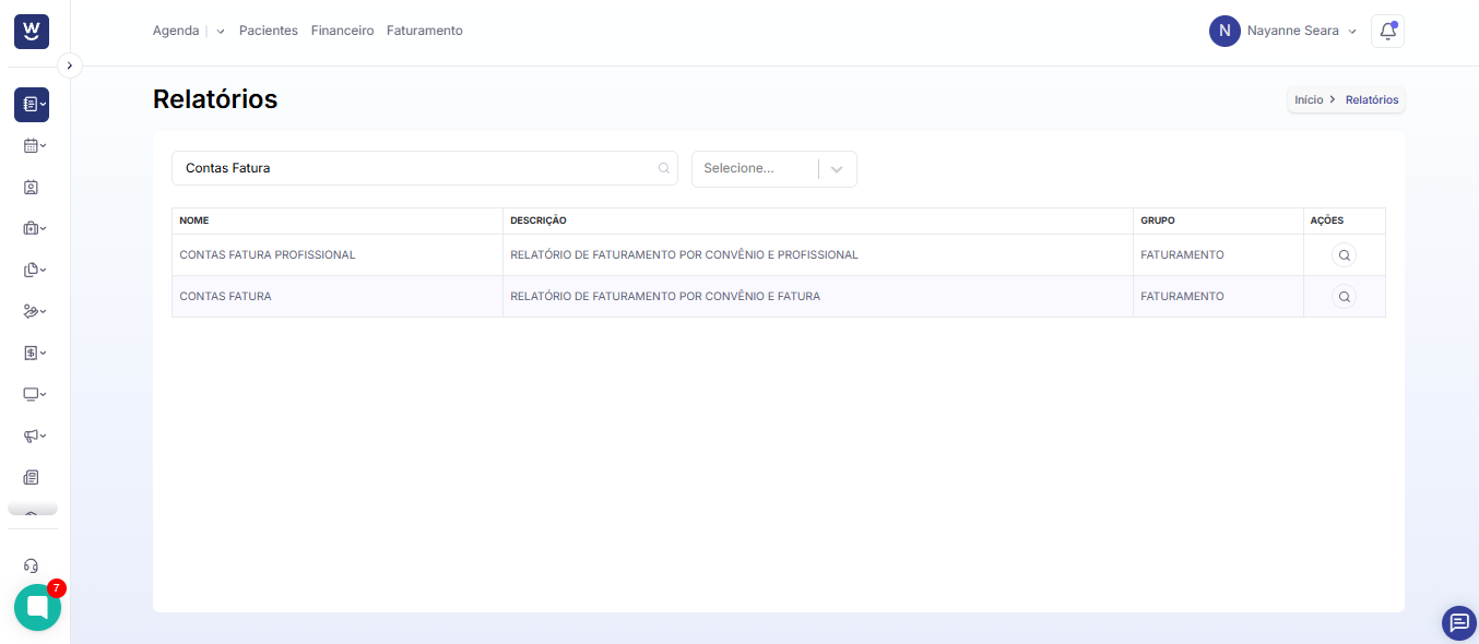 No campo "Nome do Relatório", digite o nome do relatório que deseja localizar, como "Contas Fatura". Após digitar, clique no nome do relatório exibido para que ele seja aberto em sua tela.