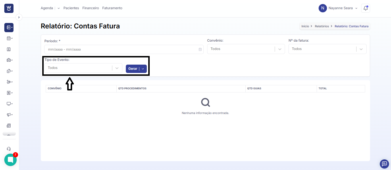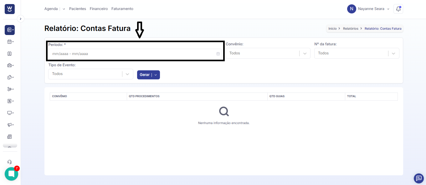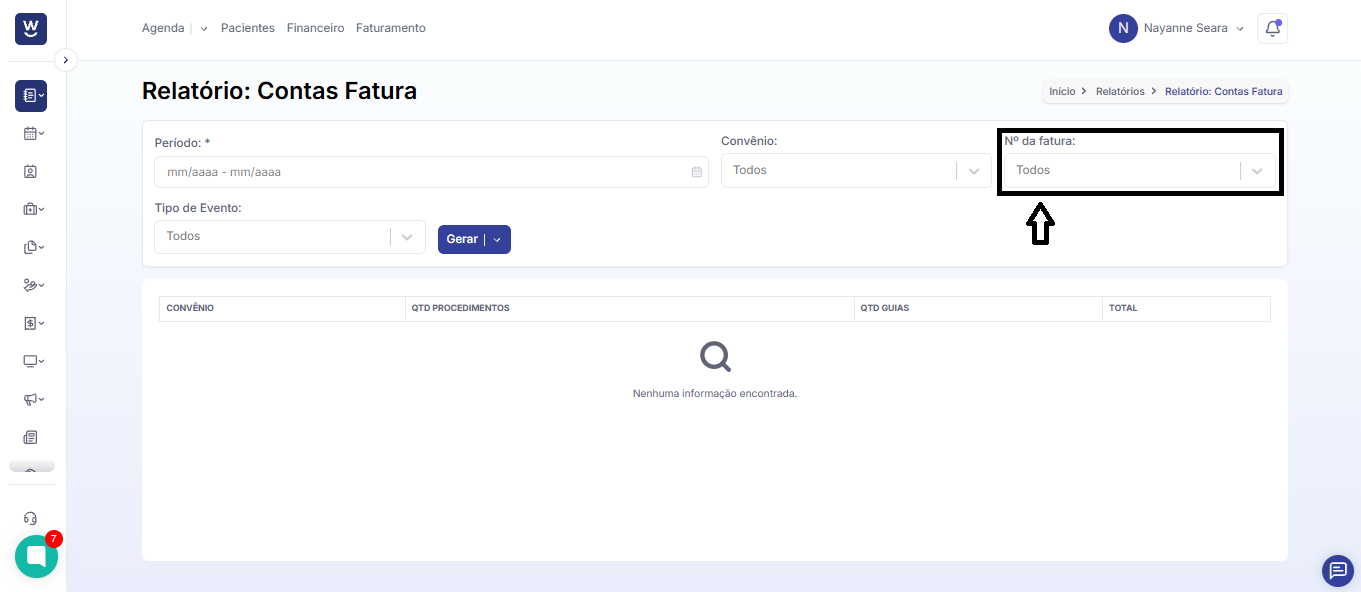 No campo seguinte informe o n° da fatura que deseja filtrar o relatório.
