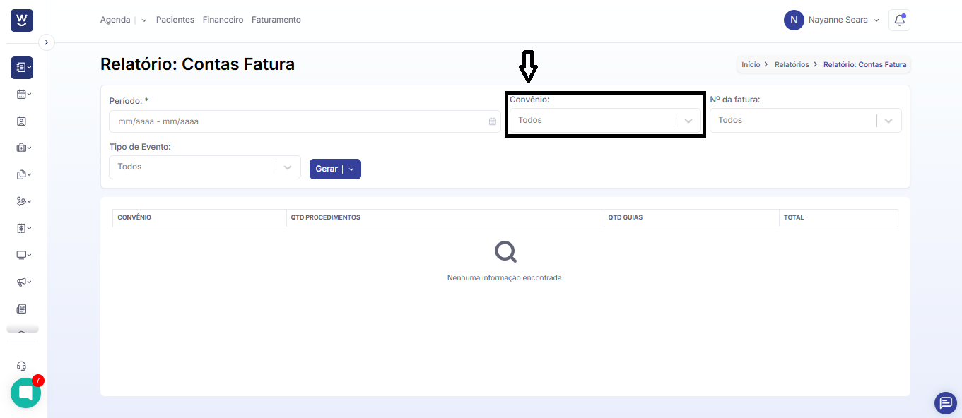 No campo “convênio”, podemos filtrar por um ou mais convênios. Caso deseje filtrar por todos os convênios, deverá deixar o campo em branco.