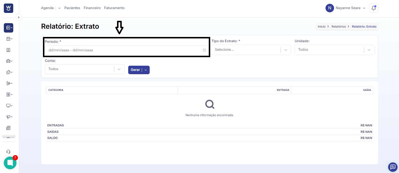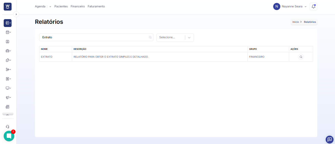No campo "Nome do Relatório", digite o nome do relatório que deseja localizar, como "Extrato". Após digitar, clique no nome do relatório exibido para que ele seja aberto em sua tela.