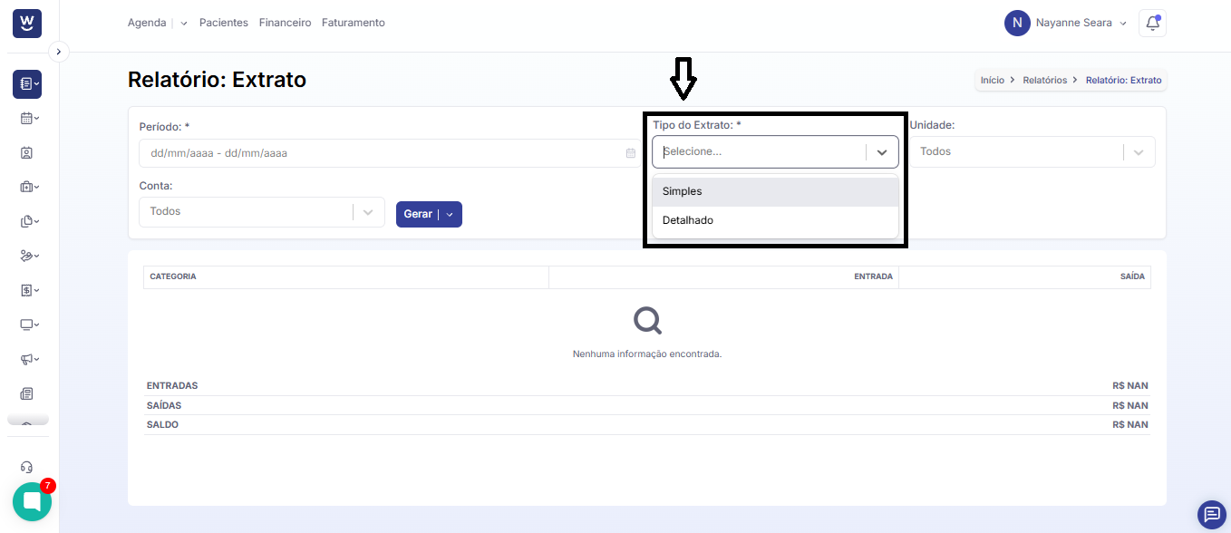 No campo seguinte, você deve indicar se deseja gerar o relatório no formato de extrato simples ou extrato detalhado.