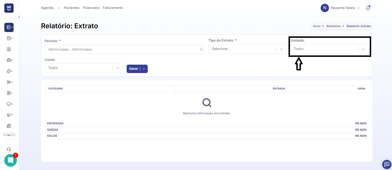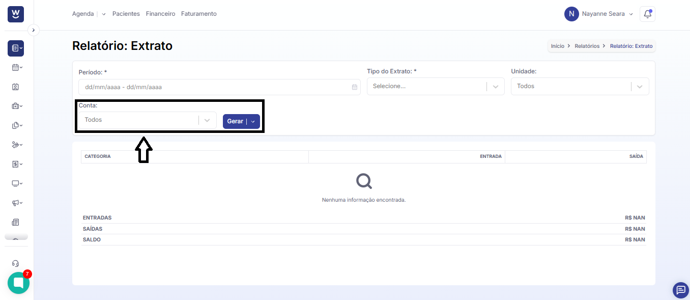 No campo seguinte, informe a conta pela qual deseja filtrar o relatório de extrato. Caso queira incluir todas as contas, basta selecionar a opção “Todos”.