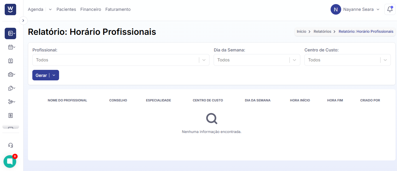 5. Após acessar o relatório, os campos para preenchimento serão exibidos na tela. Primeiro, informe o período desejado, selecionando o dia da semana, o nome do profissional e o centro de custo para filtrar o relatório. Em seguida, clique em "GERAR" para criar o documento.