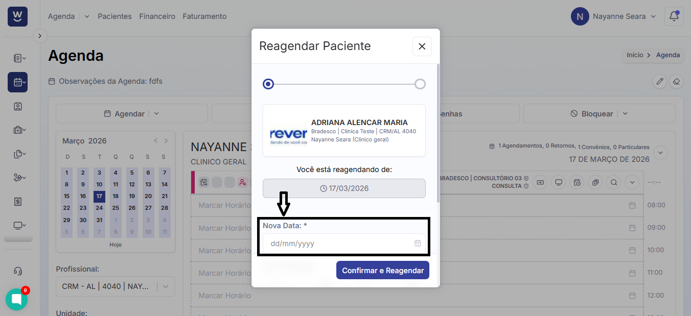 É necessário clicar no segundo ícone, onde o sistema exibirá uma nova janela de reagendamento: Nessa janela, você deve informar a nova data que deseja reagendar o paciente.