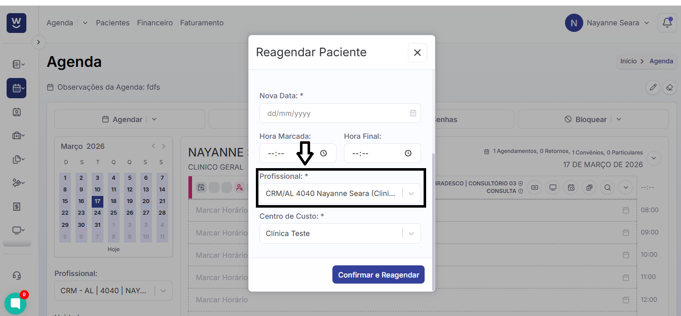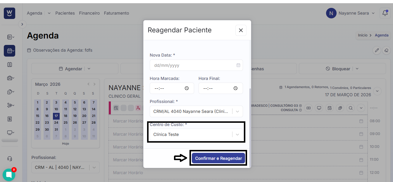 Após, deve informar para qual centro de custo deseja reagendar o paciente e, em seguida, clicar em “confirmar e reagendar”.