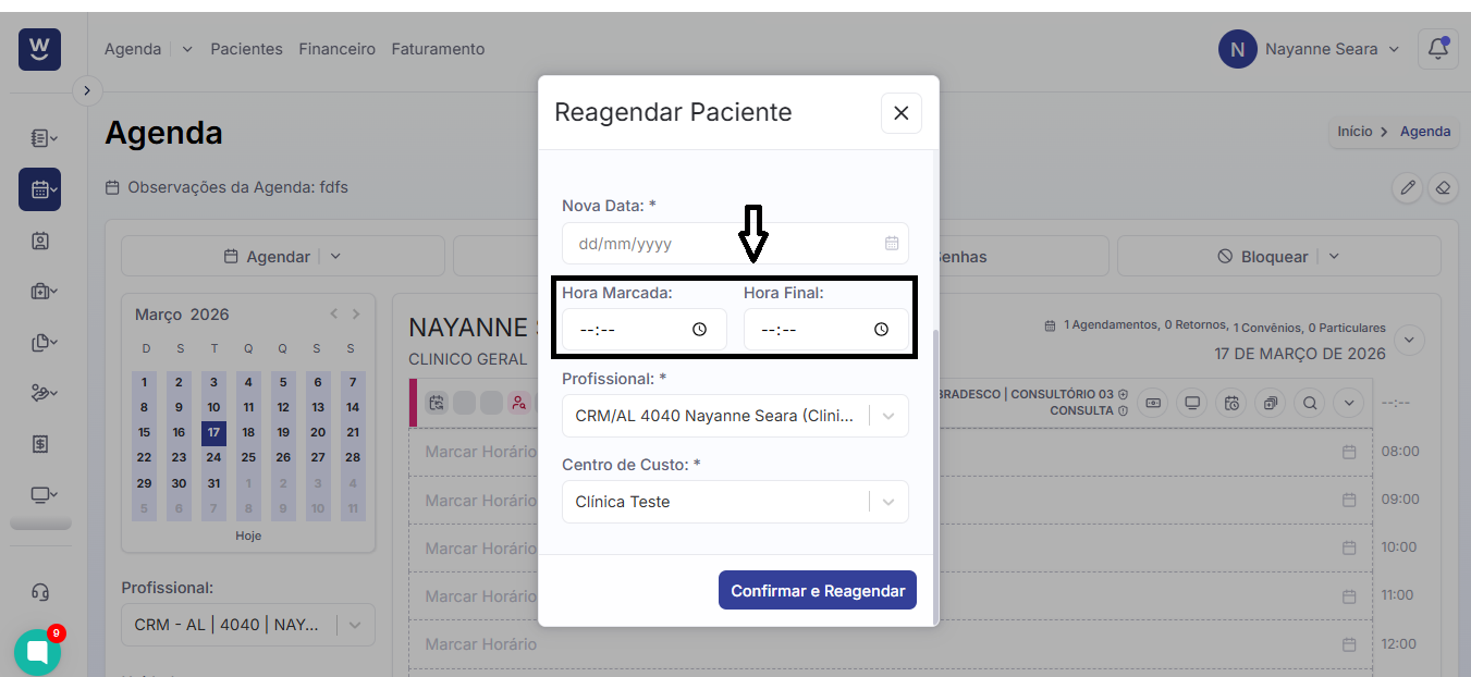 Ao selecionar a nova data, o próximo campo a ser preenchido é a hora inicial e final que deseja reagendar o paciente informado.