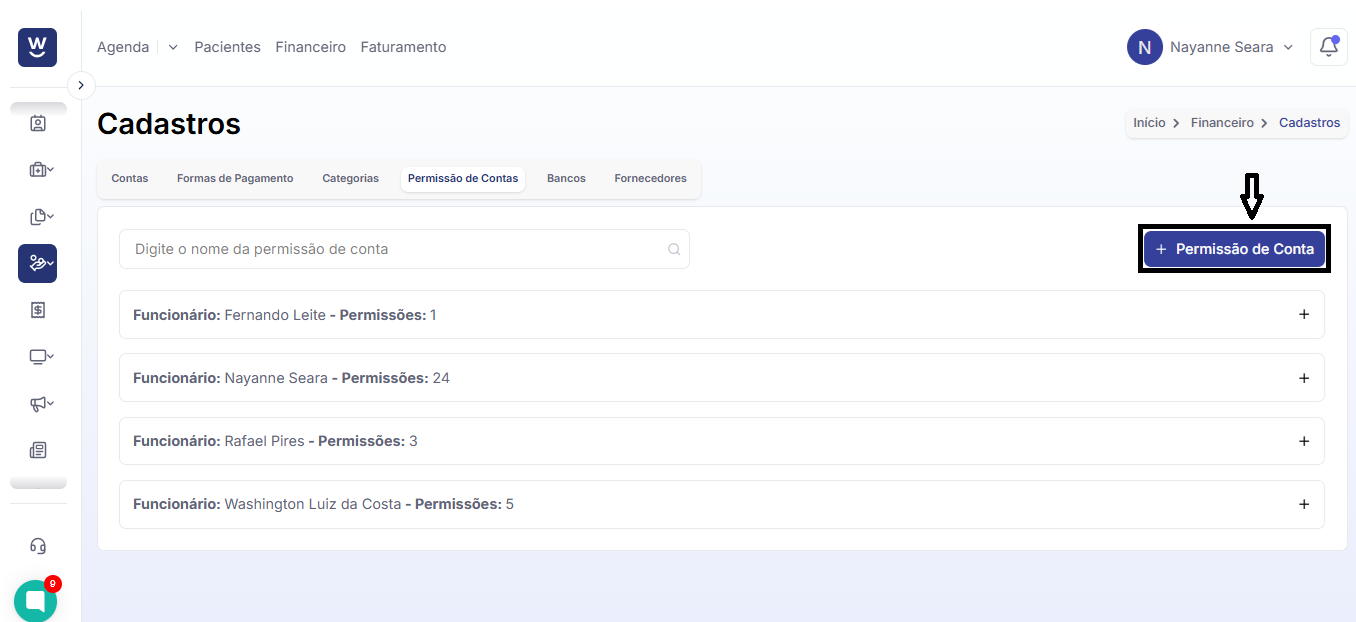 Nesta página que apareceu em sua tela, será onde cadastraremos todas as permissões de contas, as quais atribuirão acesso a todas as informações financeiras da clínica. Para isso, clique em “+ PERMISSÃO DE CONTA”.