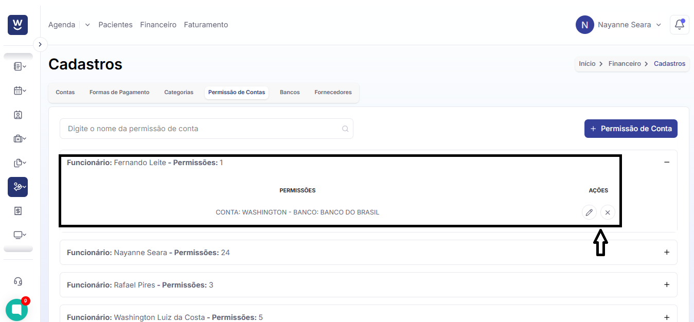 7. Caso deseje remover ou editar alguma permissão de conta concedida a um funcionário ou profissional, clique no nome correspondente para realizar a edição ou exclusão. Ao lado esquerdo, você verá a opção “AÇÕES”, onde encontrará o ícone de lápis para edição e o "X" para exclusão da permissão.