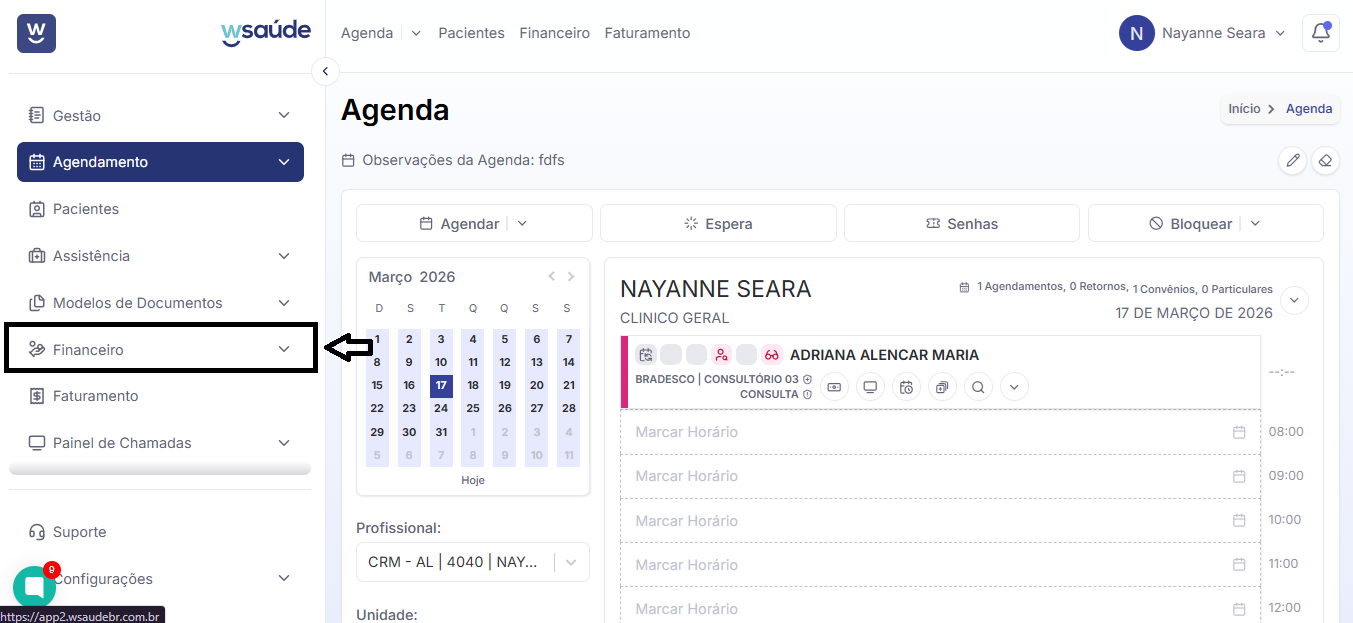 Na tela inicial do WSaúde, clique na seta na parte superior esquerda da tela, próximo ao nome “AGENDA”.