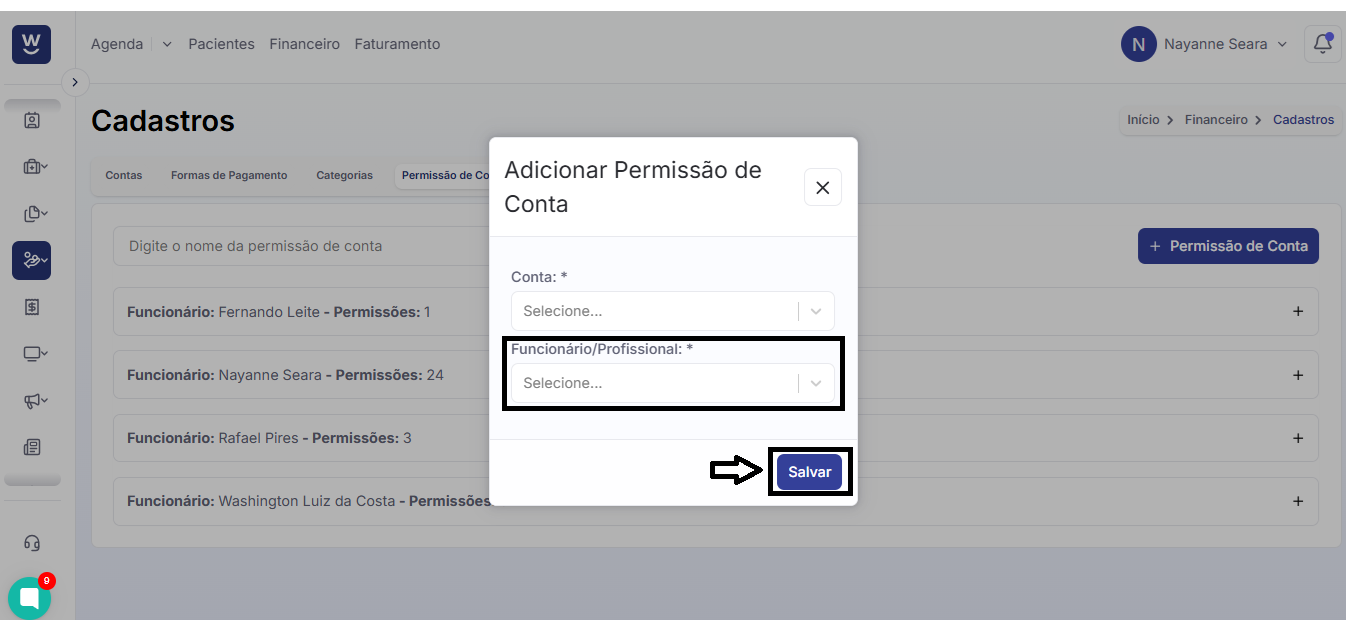 O próximo passo é escolher o funcionário ou profissional para o qual você concederá permissão de acesso às informações financeiras. Após isso, clique em “SALVAR” para finalizar o cadastro. Repita os passos 4, 5 e 6 sempre que desejar criar uma nova permissão de conta.