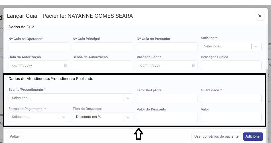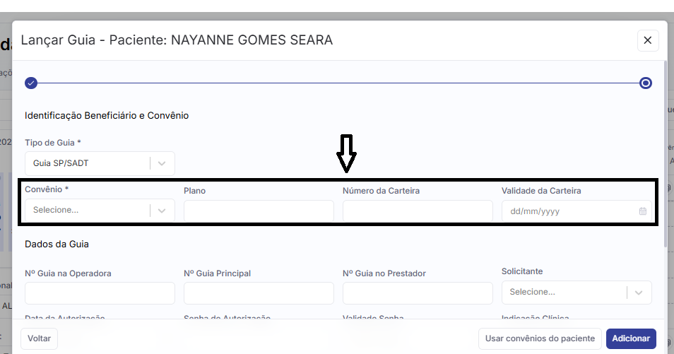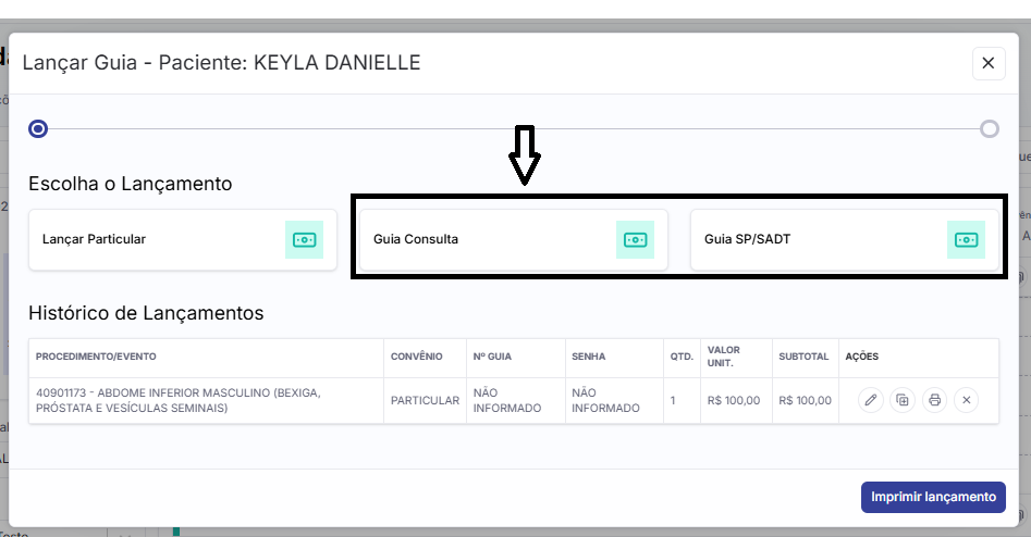 Caso seja convênio, selecione “Guia Consulta” para lançamentos de consultas e “Guia SP/SADT” para lançamentos de exames ou procedimentos.