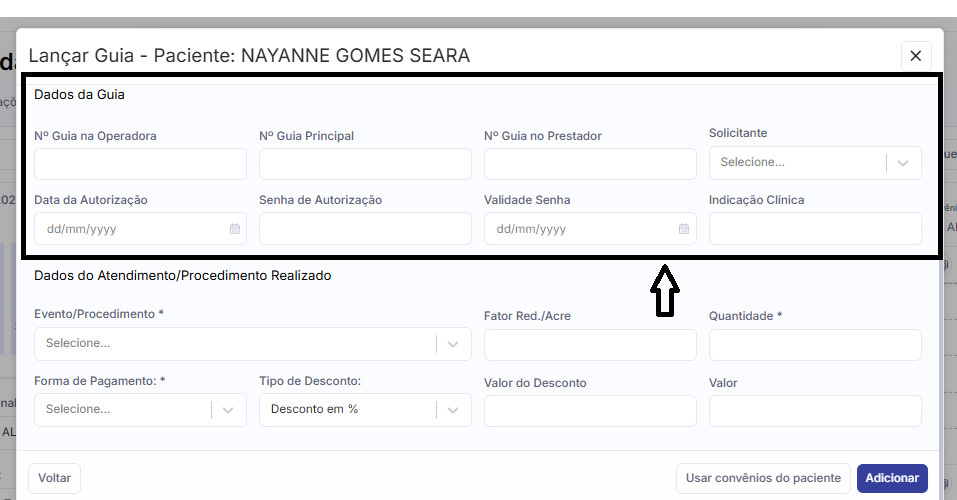 O próximo passo é preencher os “Dados da Guia”. Nessa etapa, você deve inserir as informações que constam na autorização do convênio do paciente.