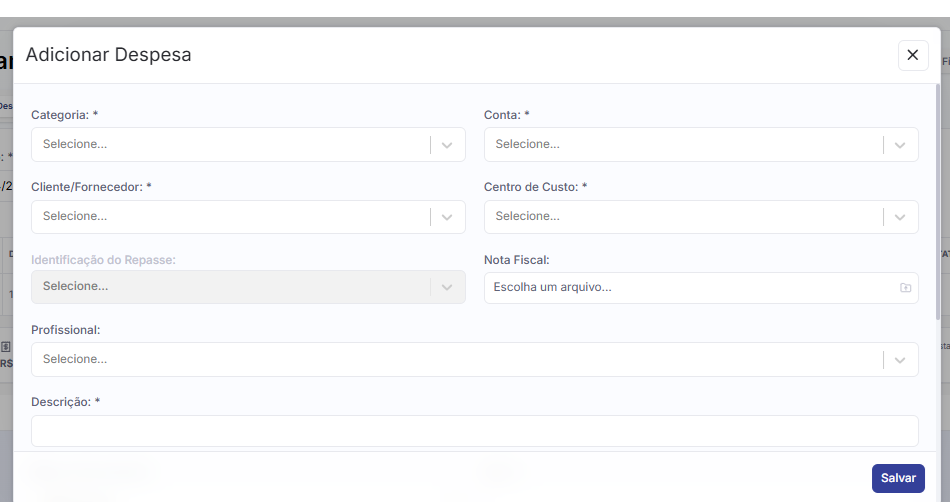 Após clicar em “+ Despesa”, uma nova janela de “Adicionar Despesa” será exibida na tela. Nela, você deve começar preenchendo os campos de categoria, conta, fornecedor, centro de custo, descrição e demais campos obrigatórios para o lançamento da despesa.