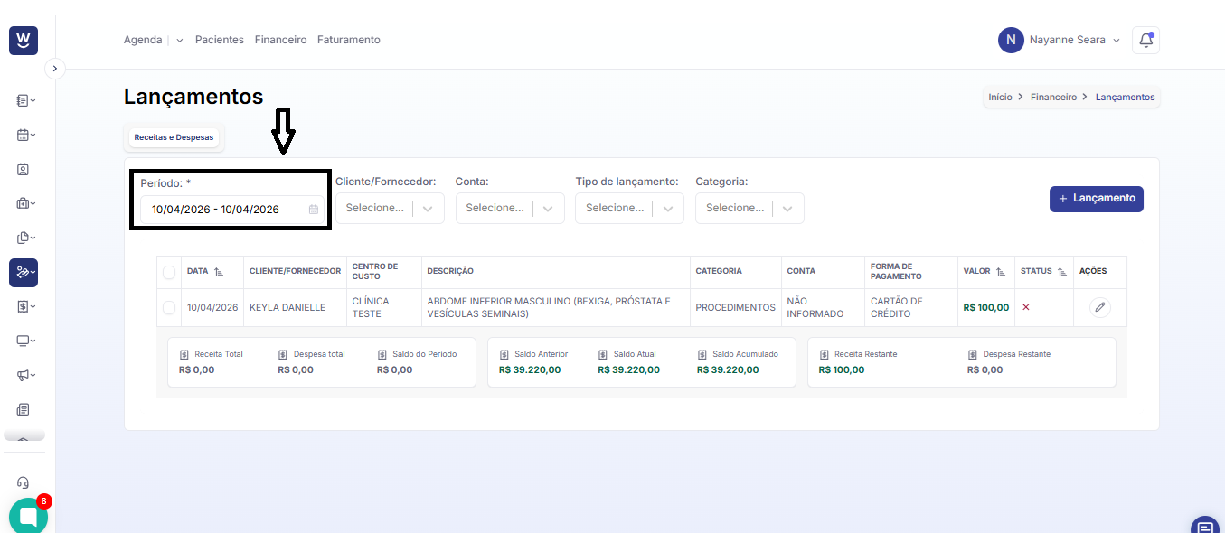 Após clicar em “Financeiro”, a tela de “Lançamentos” será exibida. Nessa tela, é possível realizar os lançamentos de pagamentos e recebimentos da clínica. Para isso, você deve começar informando o período que deseja visualizar no filtro indicado na imagem abaixo.