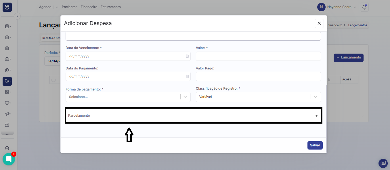 Ao final dos campos, você encontrará a opção de “parcelamento”. Essa opção deve ser usada caso a despesa lançada seja uma despesa parcelada para outros meses.
