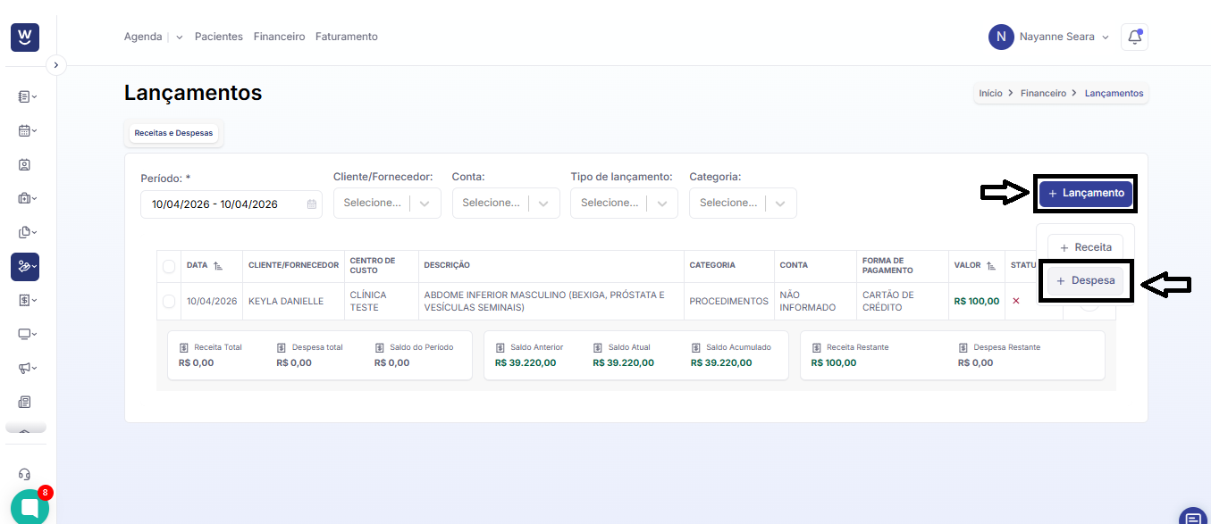 Para realizar o lançamento de uma despesa da clínica, você deve clicar em “+ Lançamento” e, em seguida, selecionar a opção “+ Despesa”.