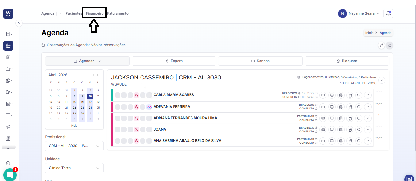 Após acessar o WSaúde, na tela inicial de agenda, clique em “Financeiro”, no canto superior da tela, para que a página financeira da clínica seja carregada.