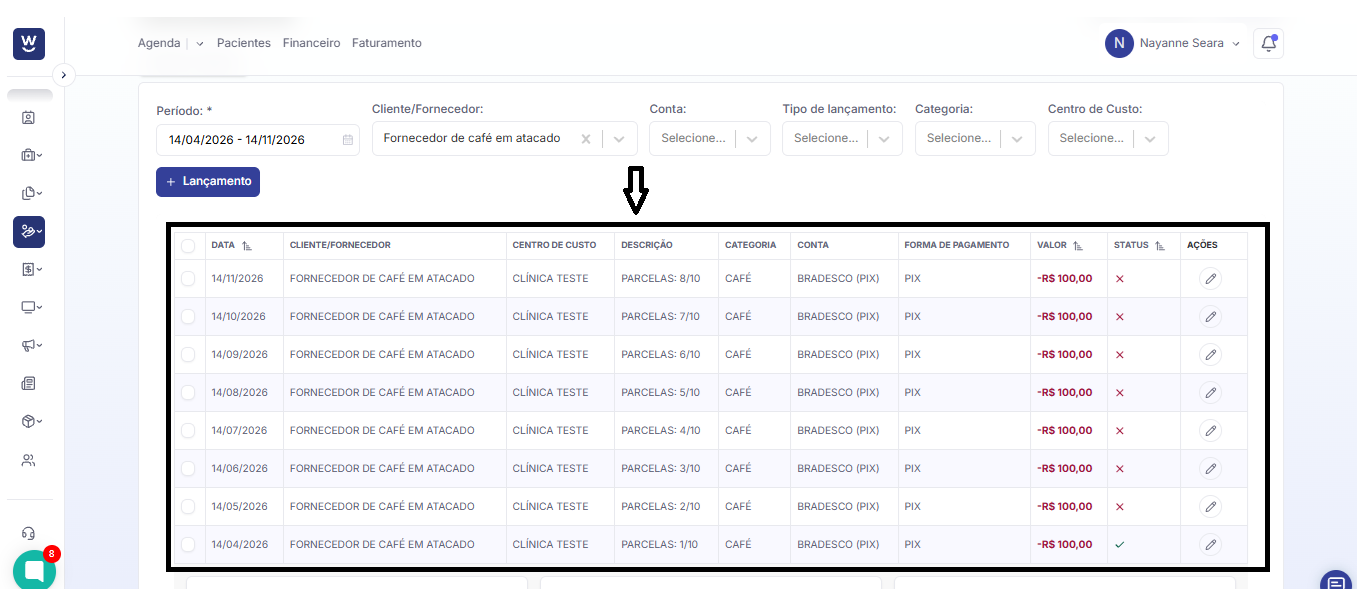 Após realizar o lançamento da despesa, ao filtrar o período correspondente aos meses das parcelas, você verá os lançamentos organizados conforme o exemplo da imagem.