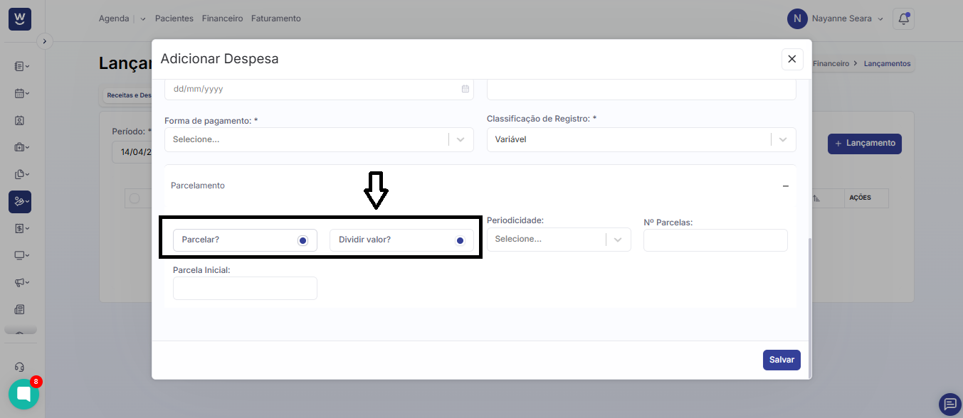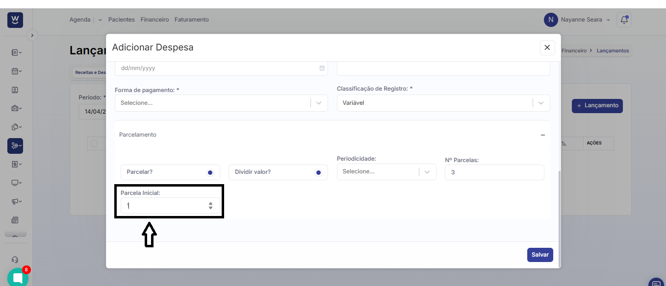 No campo seguinte, informe a quantidade de parcelas em que esse lançamento será dividido.