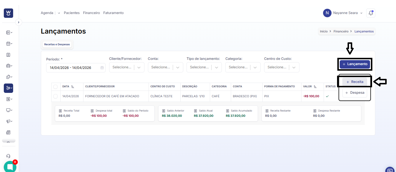 Para realizar o lançamento de uma receita da clínica, clique em “+ Lançamento” e, em seguida, selecione a opção “+ Receita”.