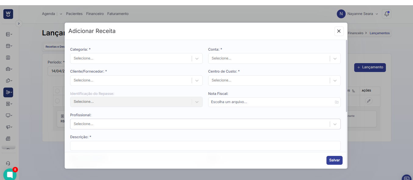 Após clicar em “+ Receita”, uma nova janela de “Adicionar Receita” será exibida. Nela, preencha os campos como categoria, conta, cliente, centro de custo, descrição e demais campos necessários.