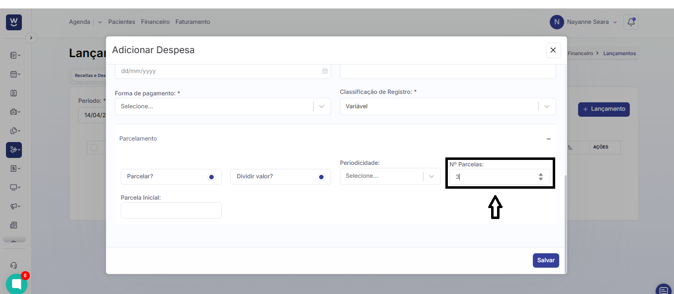 Preencha o campo “Nº de parcelas” com o número desejado. Por exemplo, se o valor será recebido em 3 vezes, informe o número 3.