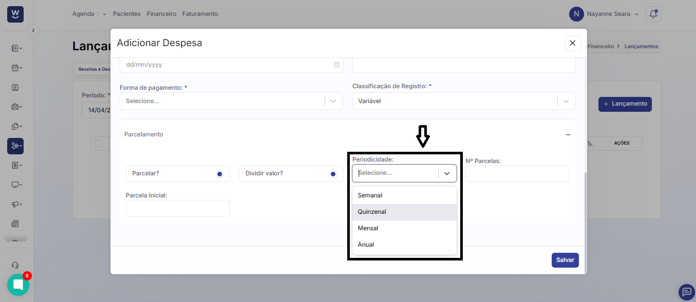 No campo seguinte, informe a “periodicidade”, ou seja, com que frequência esse recebimento irá ocorrer.