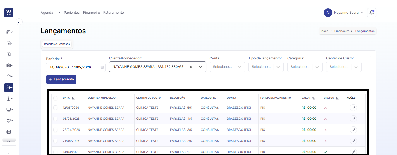 Após clicar em “Financeiro”, a tela de “Lançamentos” será exibida. Nessa tela, é possível realizar os lançamentos de pagamentos e recebimentos da clínica.