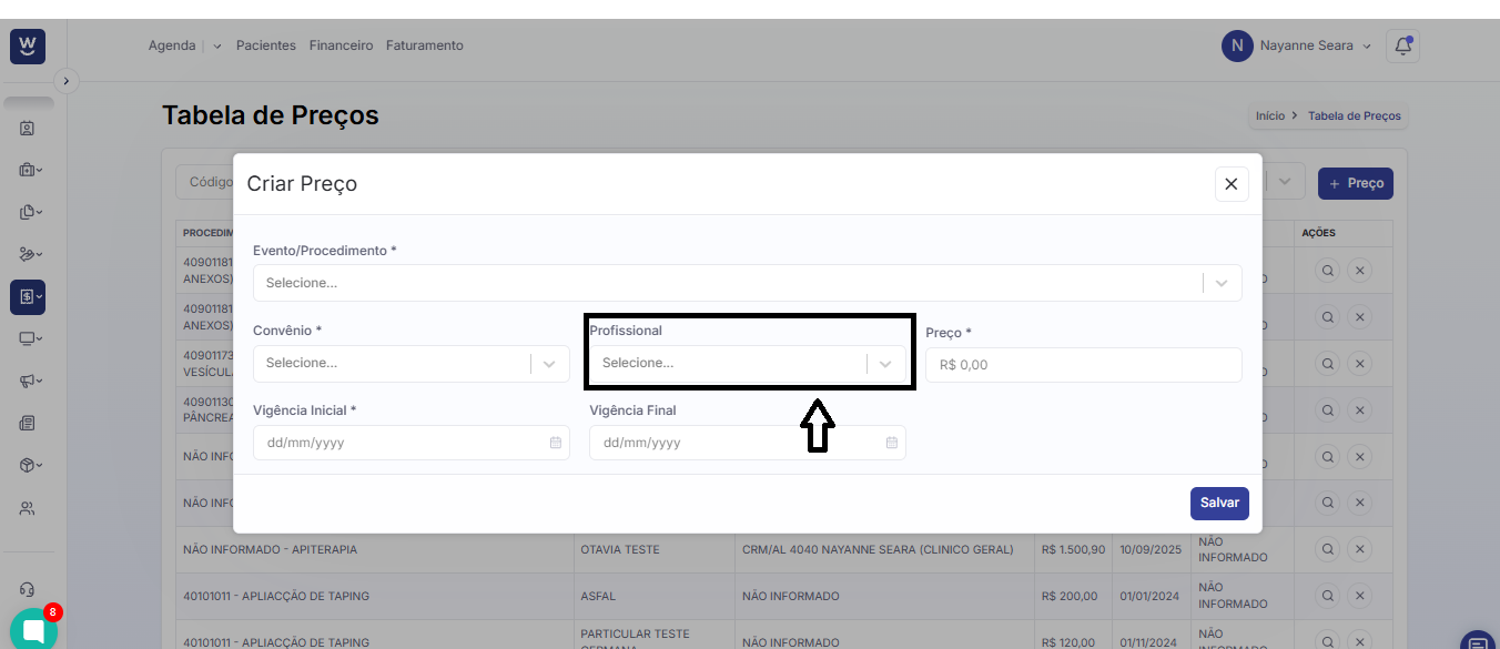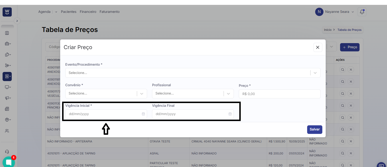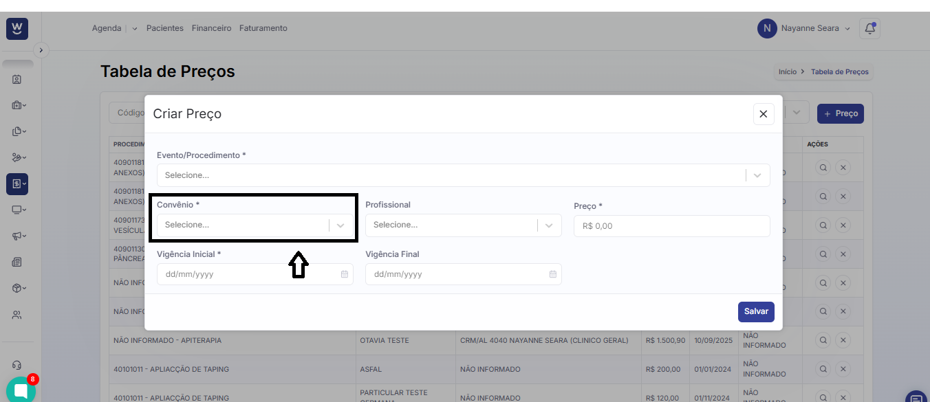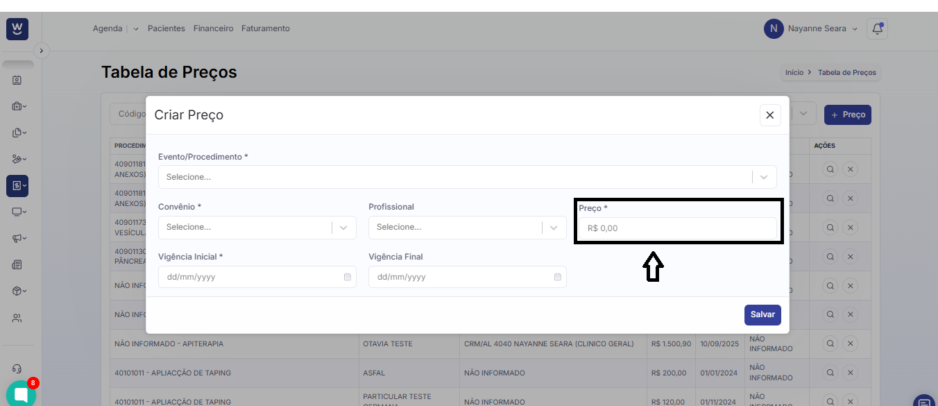 No campo seguinte, informe o valor que deseja atribuir ao procedimento cadastrado na tabela de preços.