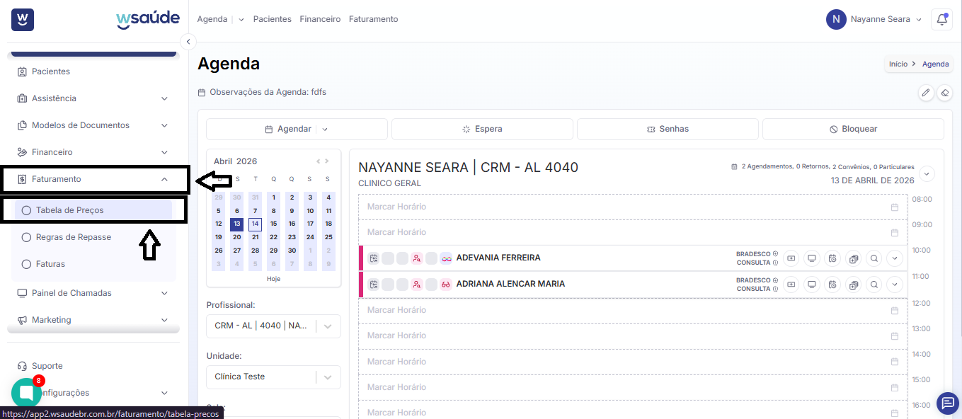 Na tela inicial do WSaúde, clique na seta localizada na parte superior esquerda da tela, ao lado do nome “Agenda”.
