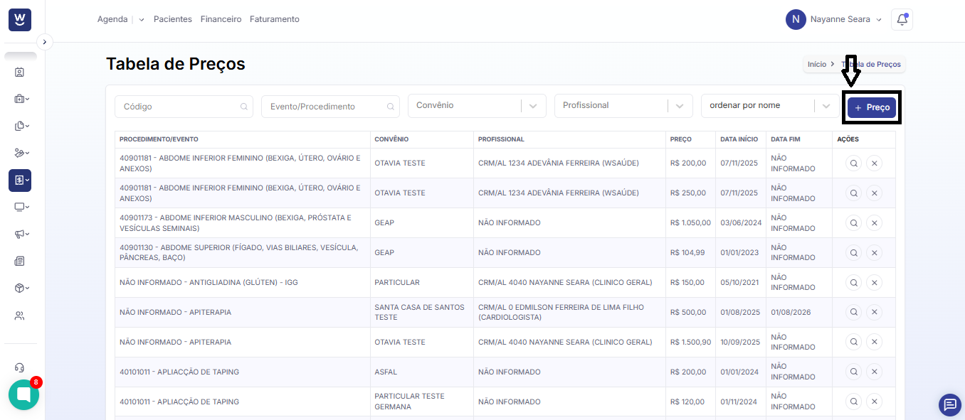 Na janela que se abriu, clique em “+ Preço” para iniciar o cadastro do valor desejado para o procedimento.