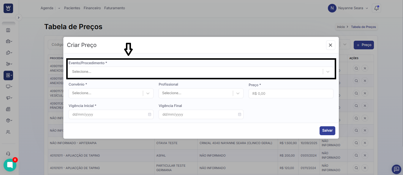 Após clicar em “+ Preço”, uma janela de “Criar Preço” será exibida na tela. Nela, comece informando qual é o “evento/procedimento” para o qual você deseja cadastrar o valor na tabela de preços.