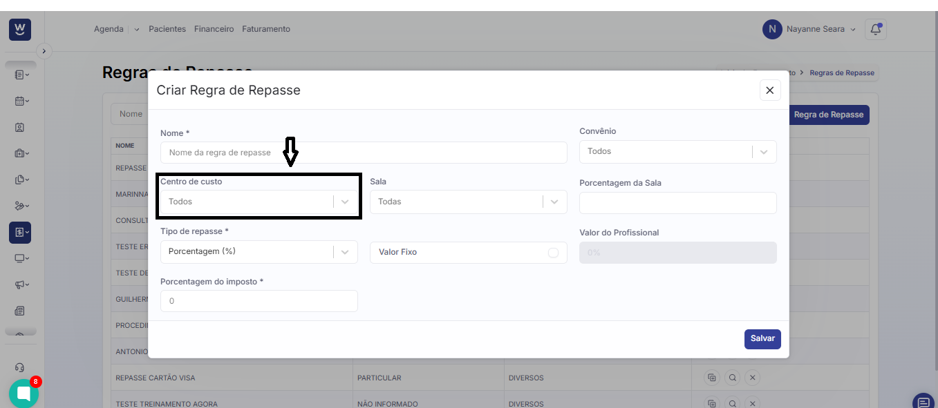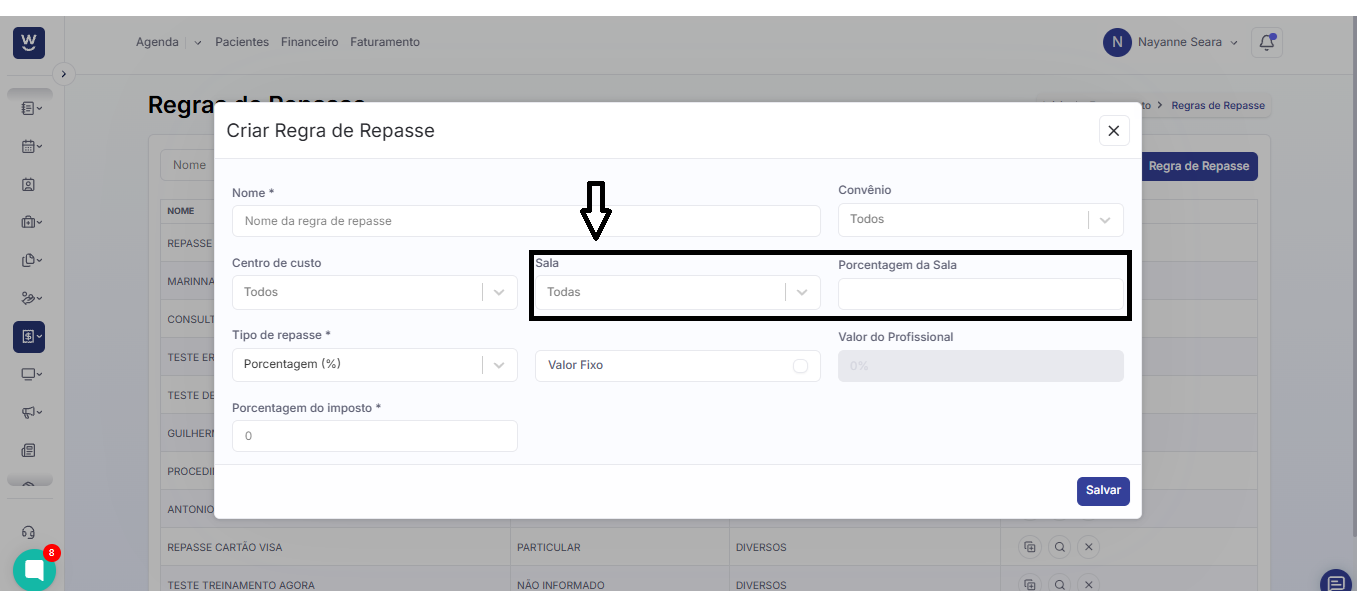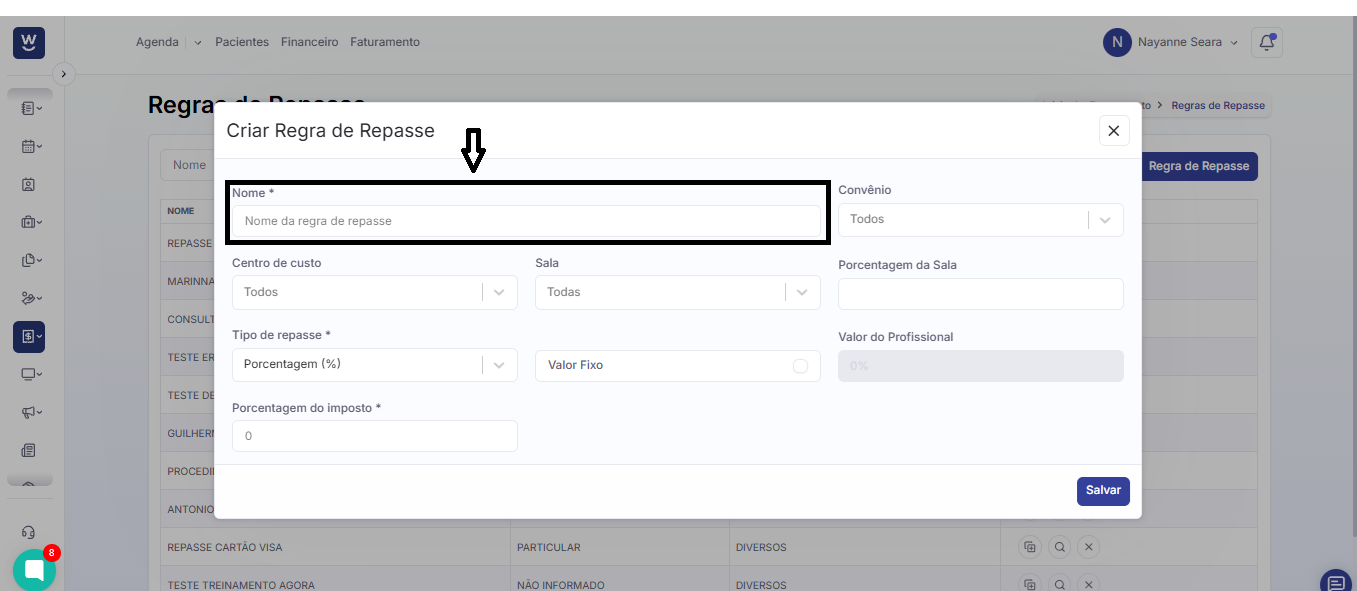 Após clicar em “+ Regra de Repasse”, uma janela de “Criar Regra de Repasse” será exibida na tela. Nela, comece preenchendo o campo “Nome” com o nome que deseja atribuir à regra de repasse que está sendo criada.