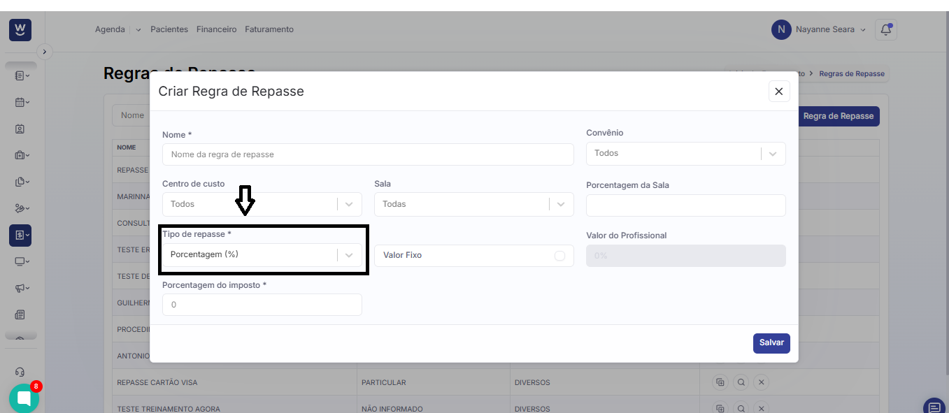 No campo seguinte, informe o tipo de repasse. Você pode escolher se o valor será calculado em porcentagem (%) ou em Real (R$).