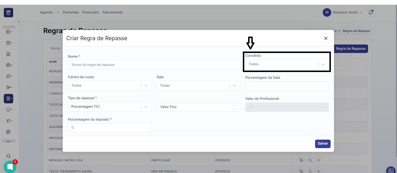 Após inserir o nome da regra de repasse, informe o convênio ao qual essa regra será vinculada. Caso queira que a regra seja aplicada a todos os convênios, selecione a opção “Todos”.
